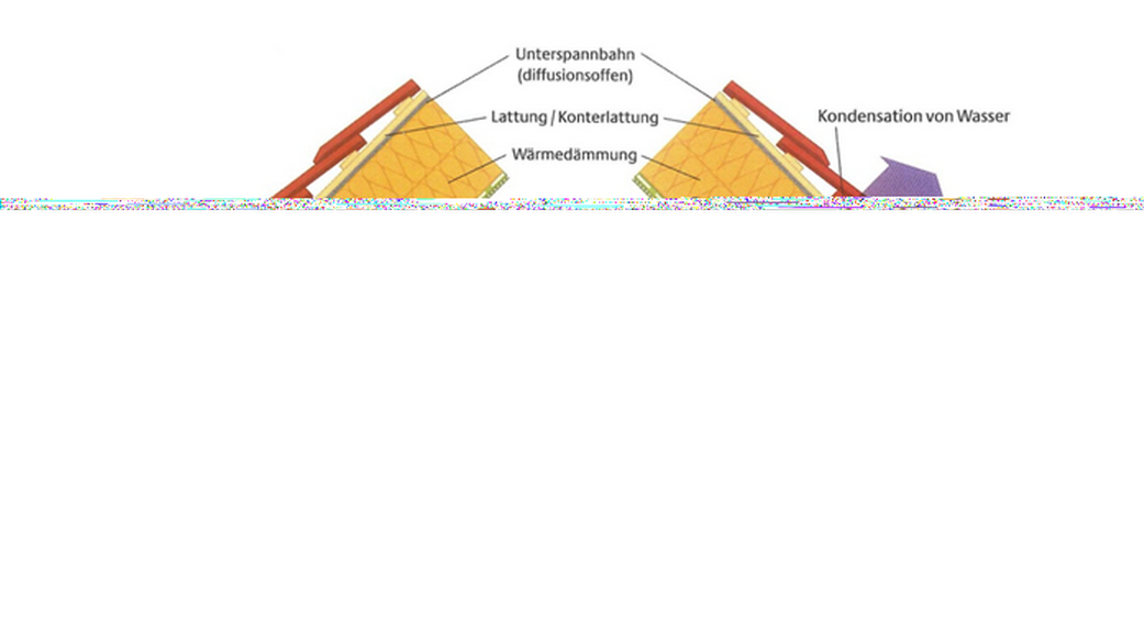 Daher muss die Innenseite der Dämmung gegen eindringende Feuchtigkeit durch eine lückenlose luft- und dampfdichte Schicht geschützt werden. Man spricht hier von Dampfsperre oder Dampfbremse. Die außen liegenden Bahnen dienen als Wind- und Wetterschutz. Sie sind diffusionsoffen, damit die eventuell angefallene Feuchtigkeit nach außen transportiert wird.